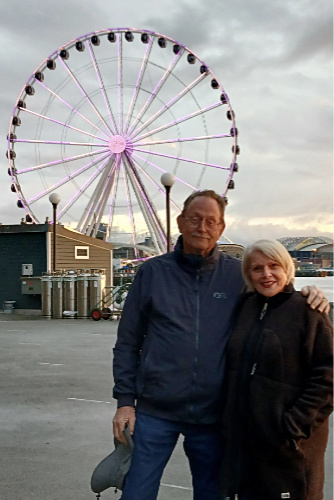 First we took the picture at the top of this page, then we walked down to the roof of the Seattle Aquarimum and took these two pictures - first Craig & Patty, then Ashley, Job, Brooke, and Jennifer - in front of the giant ferris wheel.