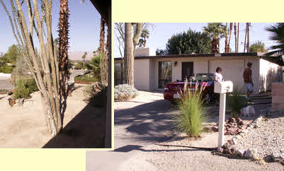 All homes are fully airconditioned and landscaping has a decidedly desert look. Here you can see a bit of the view of the valley - around the desert foliage - and also Patty following C.J. around her car. This was taken before Olivia moved down from Davis, CA.