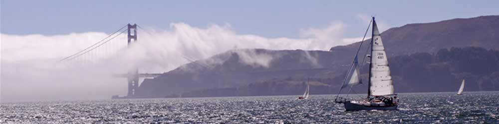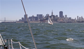 The next morning we planned a leisurely sail around the bay to Alameda, then back to Sausalito. There was fog this morning, but it pulled back as we sailed. Sailing by the Maritime Museum we could see the Transamerica building on the right and Coit Tower on the left.