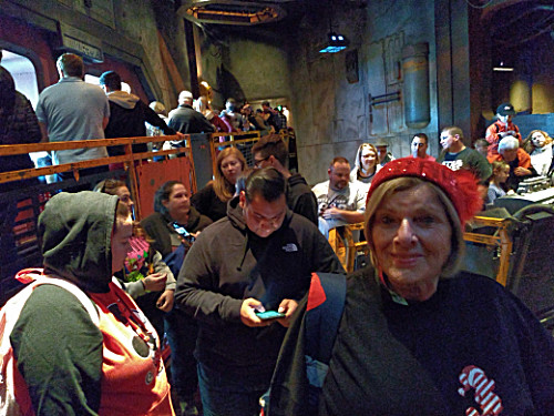 We got There early - just after 8am on a weekday - and this is Patty waiting in line to get into the only ride open at Galaxy's Edge.