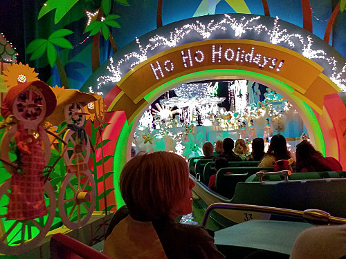 Pictures were hard to come by during most of the rest of the day, but as evening fell we did get this one of Patty on the It's A Small World ride.