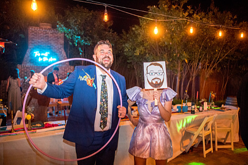 As they started to walk through the attendees, Flower Brian leaped on the stage and shouted, 'Let's have a parade'. Then the bride and groom turned around and walked back through the gazebo, out to the street, and started to parade around town.