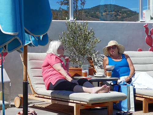 Patty and Ellen had breakfast in the cafeteria, then changed and wandered out by the pool to relax before checkout and lunch with a number of the remaining wedding attendees.