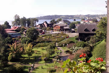 Puerto Mott was the unexpected surprise on our journey. We had no expectations for this port, but it turned out to be very beautiful and full of fun. It is the place in Chile where the Andes begin to sink into the Pacific Ocean, ending at Cape Horn. South of here are thousands of islands and fjords. The city itself isn't much, but the Lake District lives up to its name. This picture above was taken from inside a restaurant in the German settlement of Frutillar (see the map below). A picture of Frutillar is on the right with Puerto Mott on the left.