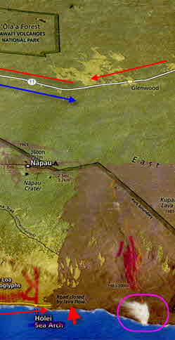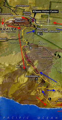 On arriving in Hilo, we rented a minivan and headed to Hawaii's active volcano area at the southeastern edge of the island. We didn't stop at the Kilauea Visitor Center, but drove around the Caldera and down the Chain of Craters Road to the end (red arrows) - lava flowing into the sea buried the end of the road in 2003.