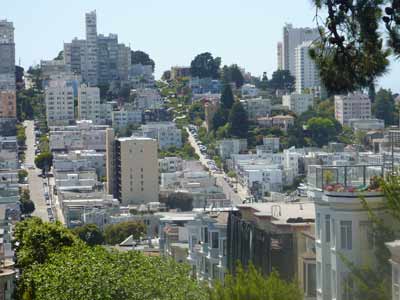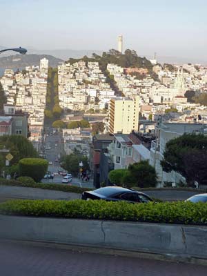 Here is a view of Lombard Street - the crookedest street in the world - from Coit Tower; then a view of Coit Tower from Lombard Street.