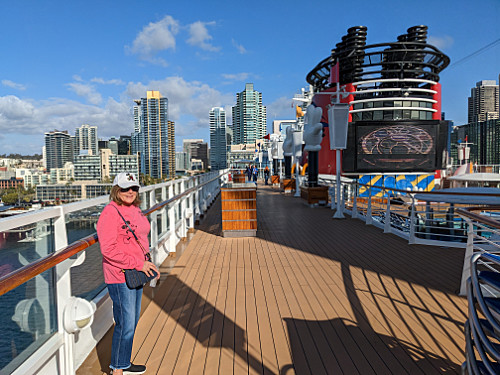 Out on Deck 10, Patty overlooks the pools and outdoor activities, including the outdoor screen used for movies and parties throughout the cruise.