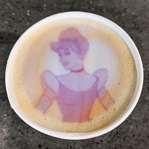 Patty wanted this picture of her with Ariel in the Atrium and, of course we had to have an Ariel picture on her next cup of coffee.