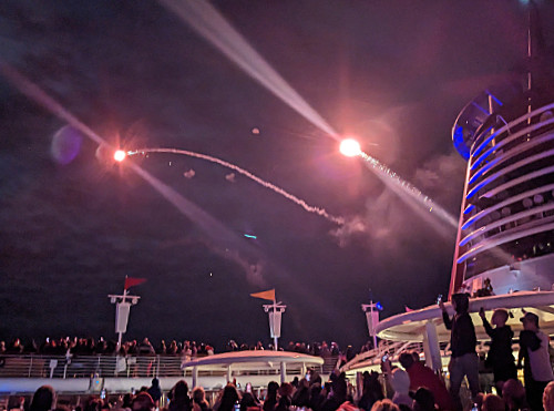 Soon Mickey zip lined down to the dance floor and shortly afterward a fireworks display started up. It was quite a show, although quite cold.