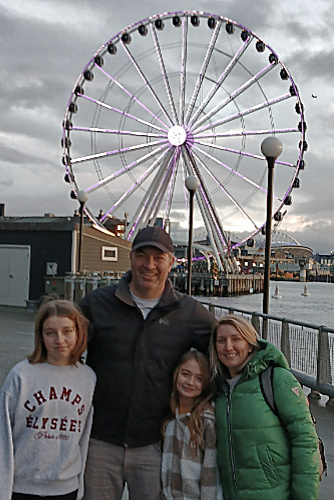 First we took the picture at the top of this page, then we walked down to the roof of the Seattle Aquarimum and took these two pictures - first Craig & Patty, then Ashley, Job, Brooke, and Jennifer - in front of the giant ferris wheel.