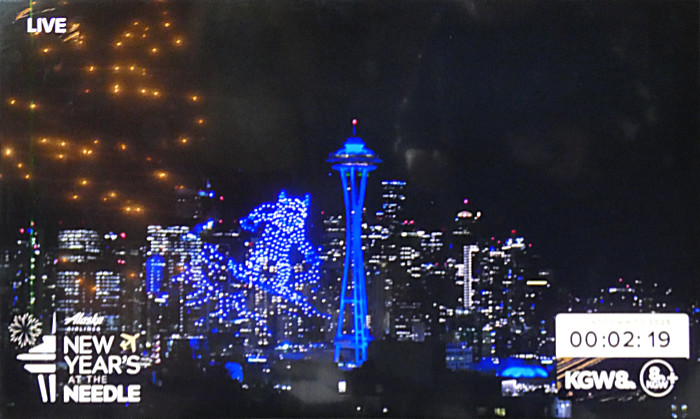 Finally midnight arrives. While Jennifer and Patty enjoy their food productions, Job and Craig watch the countdown on Seattle television.
